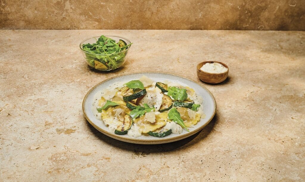 - Carefully plate the raviolacci in a deep dish with the grilled zucchini and fresh arugula. Finish with shaved Parmesan cheese for garnish.